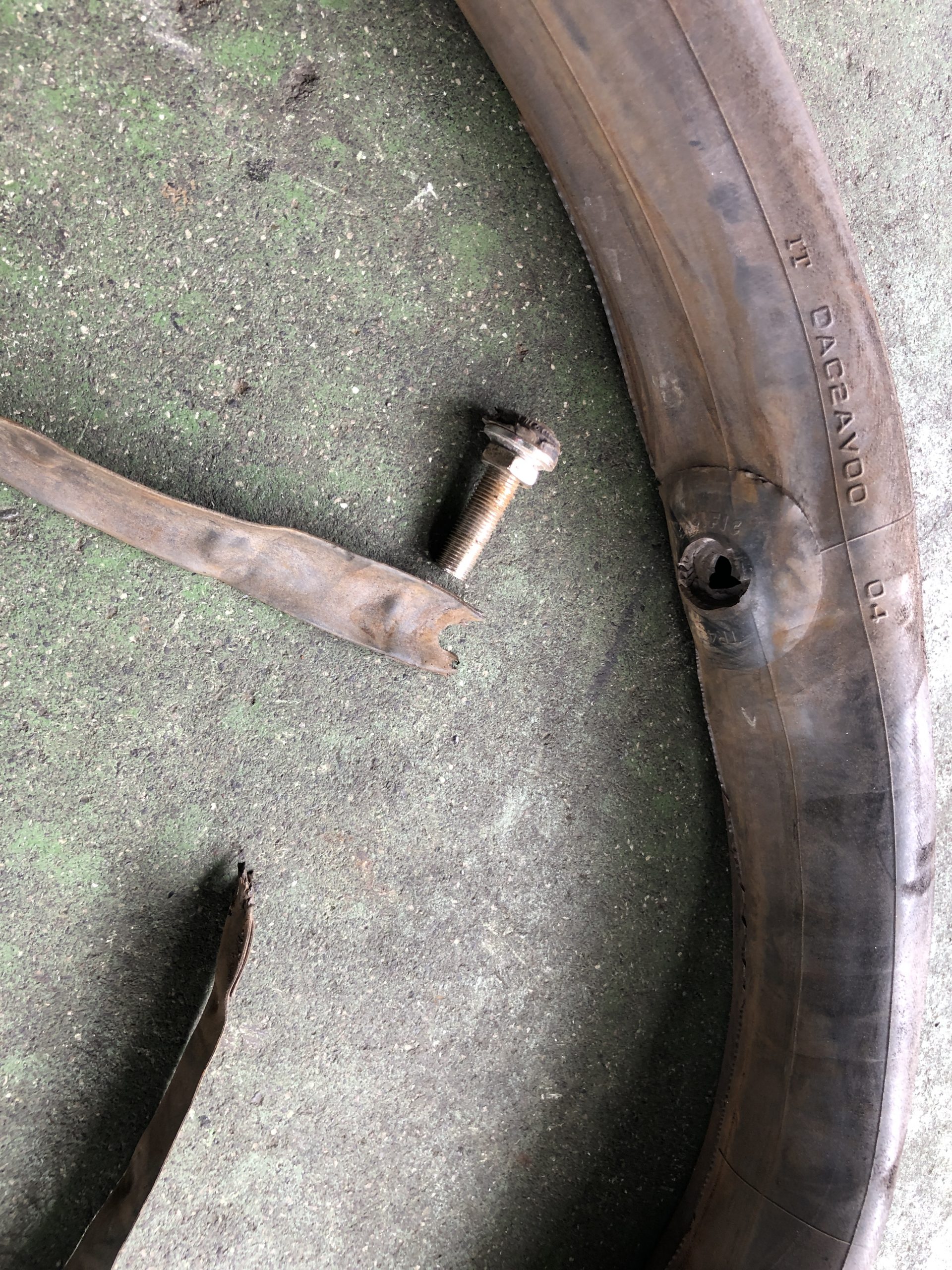 カブはパンクしたまま走行したため、チューブの口がちぎれリムバンドも切れていました。チューブタイプのバイクはパンクとわかったら走行しないでください。写真の様になるとパンク修理できません。