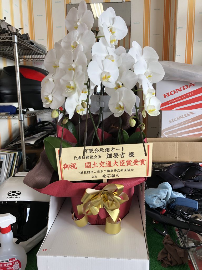 店長は代理なので登壇しませんでしたが、緊張しまくりでした。国土交通大臣は式前日に交代したばかりなので賞状はまだ届いておりません。二輪車普及安全協会からお花を頂きました。