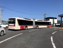 今日車検場に凄いバスがいました。とにかく大きい・長い。たぶん静岡空港内を走るバスだと思います。真横から見るとこんな長さです。フルトレーラーよりも迫力があります。走る道を下調べをしておかないと走れない長さ。