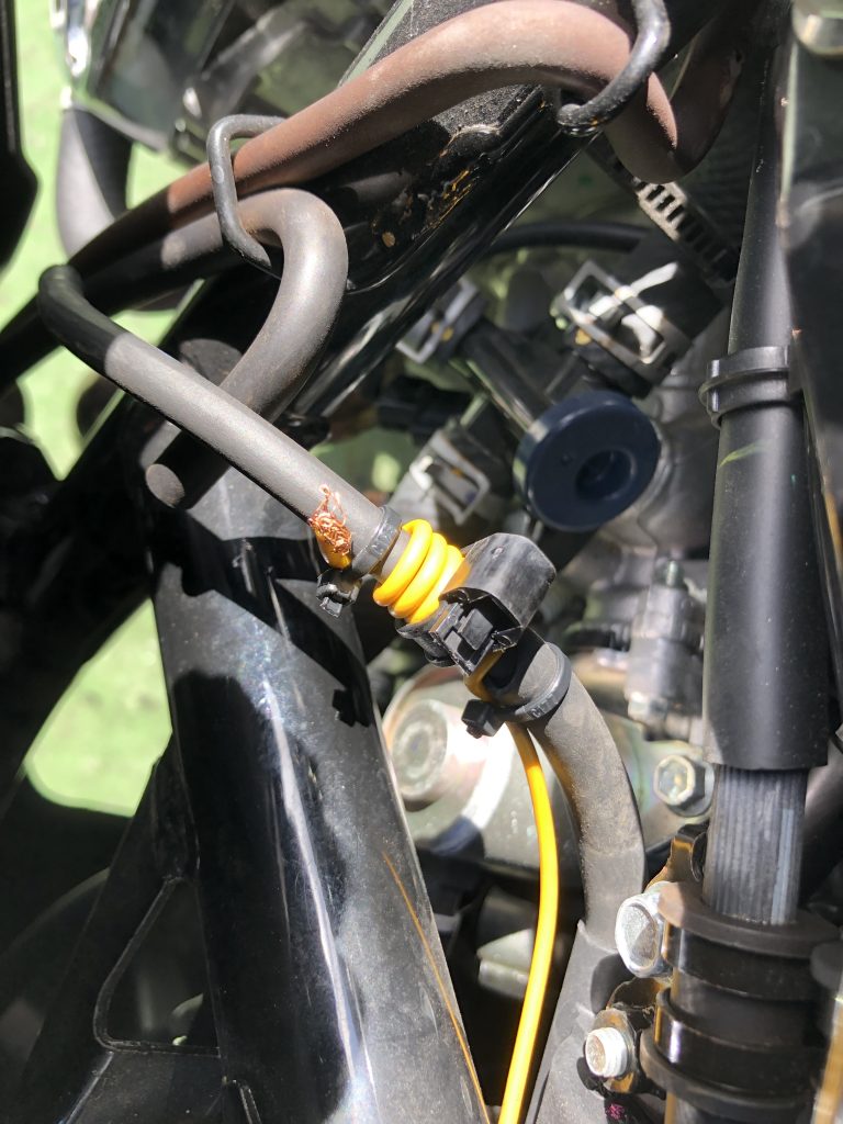 後付けの社外電気式タコメーターが時々反応しないと入庫のNMAX。社外の電気式タコメーターは信号をイグニッションコイルの端子からとるタイプとプラグコードに配線を巻き付けてとるタイプとあります。入庫した車両は後者。巻き付けが甘く緩んでいました。プラグコードには保護チューブが付いていましたので少し切ってコードに直接巻き付け、結束バンドで緩まないように固定し保護テープを巻いて完成。