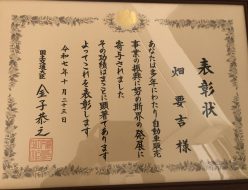 先日ブログで書いた会長畑要吉の表彰状が届きました。大臣が交代したばかりだったので、届くまでに日数がかかったようです。二輪車普及安全協会の方が届けてくれました。