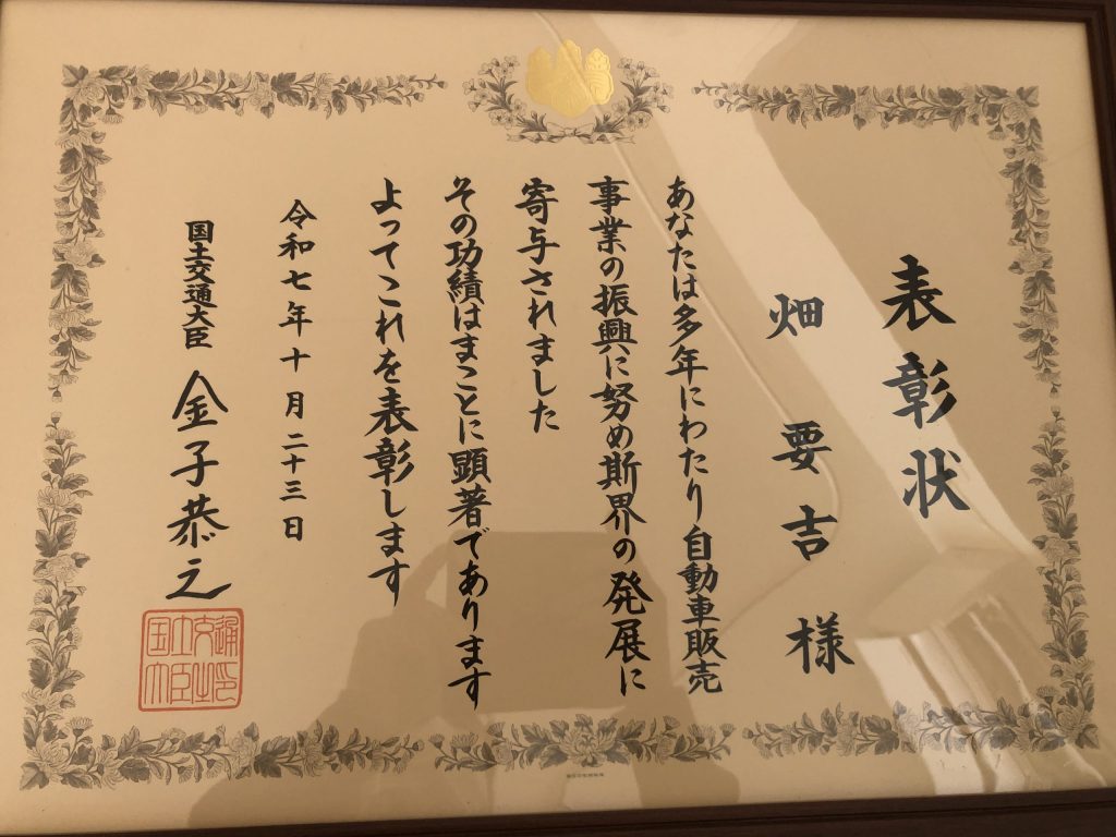 先日ブログで書いた会長畑要吉の表彰状が届きました。大臣が交代したばかりだったので、届くまでに日数がかかったようです。二輪車普及安全協会の方が届けてくれました。