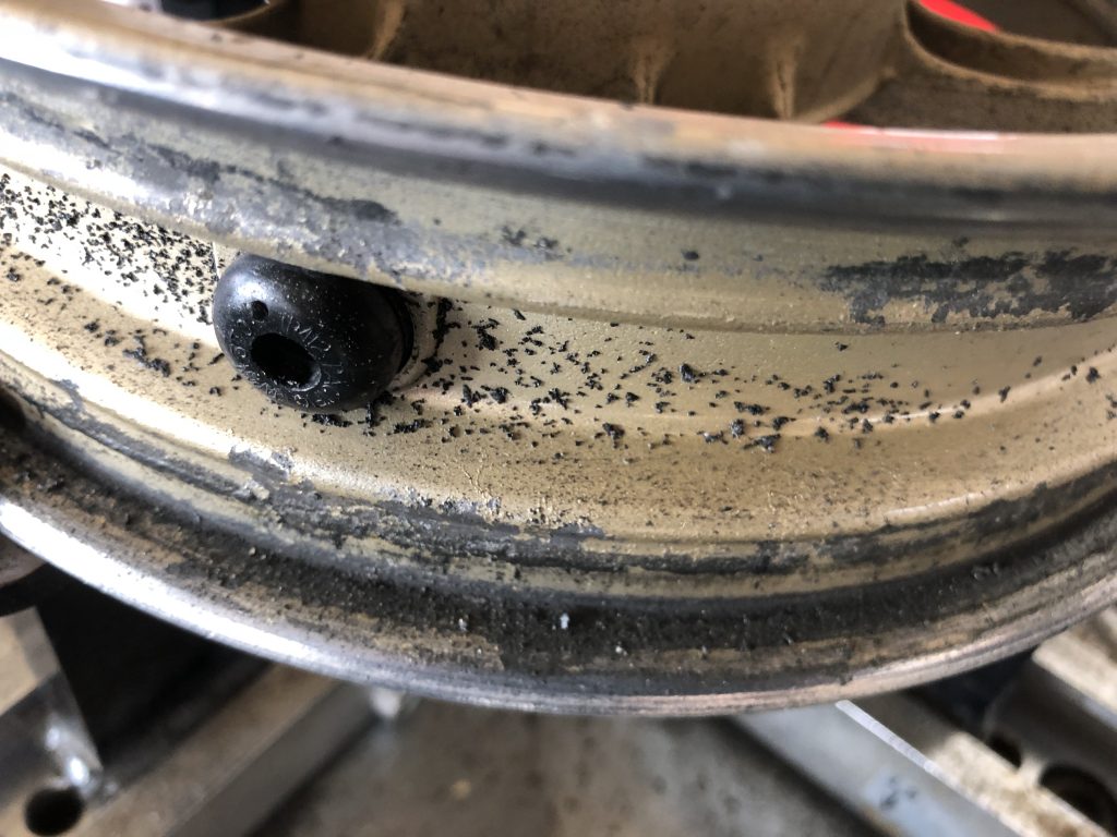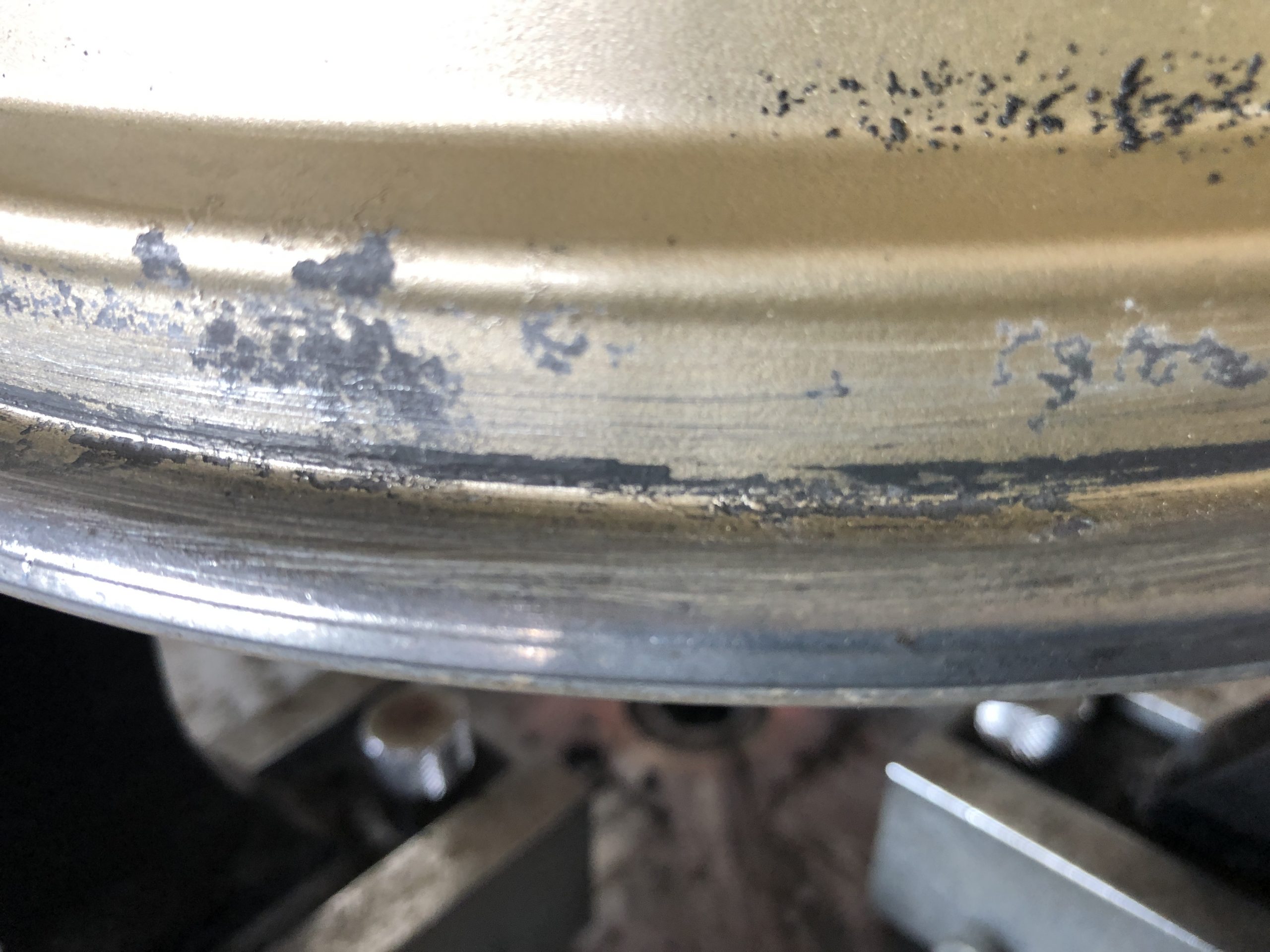 空気圧の少ないまま乗り続けた車両のリム部は、写真の様に汚れていることが多いです。走行中タイヤの空気圧が少ないためにタイヤとホイルの密着が弱くなりホコリや水が入ったり、ブレーキ時にタイヤとホイルが少しズレたりすることでなります。