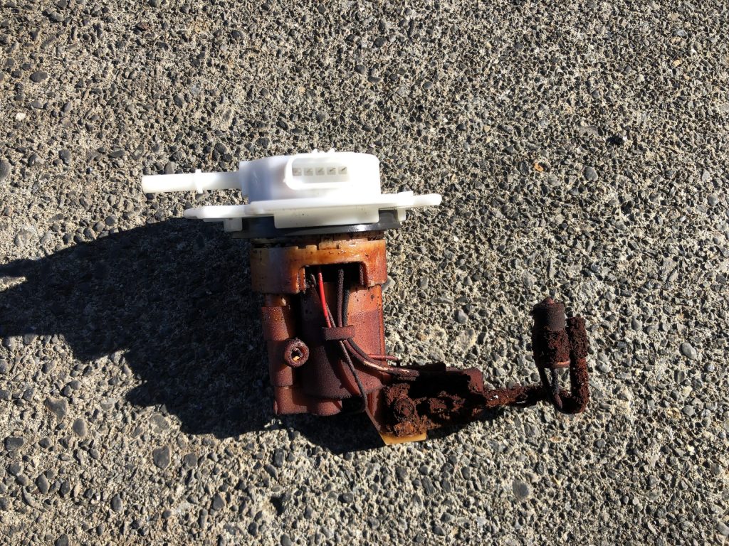 いつから乗っていないのかわからないリトルカブ。タンクはサビだらけ。燃料ポンプは写真の状態。燃料ホースとインジェクターも交換。結構な部品代となりました。