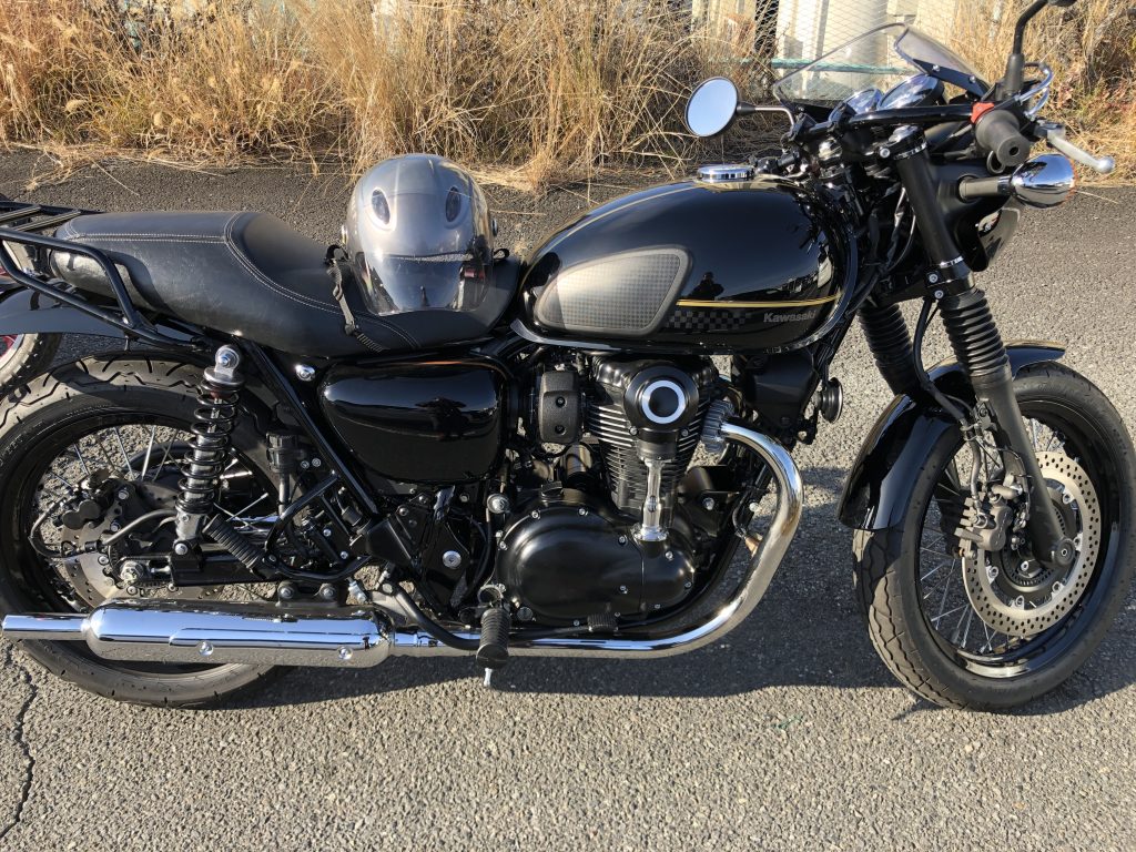 今日の車検はW800カフェの中古車新規登録。スワローハンドルのついた前傾姿勢純正カフェレーサー使用です。「カフェレーサー」店長の世代には懐かしい響きです。