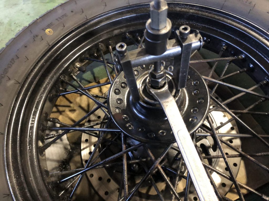 ホイルベアリングの交換。タイヤ交換時や車検整備時に点検しています。異常がある場合はお客様に連絡して交換します。スズキのレッツ4やアドレスV125はグリス切れを起こしている車両が多いので要注意です。ベアリングが破損していてホイルを外すとボールが出てくることも。走行中に異常異音を感じたらご相談ください。