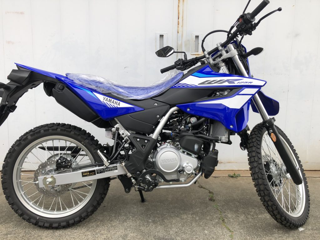 WR125Rをリンク交換でローダウン。フロントフォークの突き出しも行いました。車体の立ちは強くなりましたが、サイドスタンドは何とか使用できます。店長は両つま先がツンツン状態。ローシートもつけなければ短足店長は無理です。