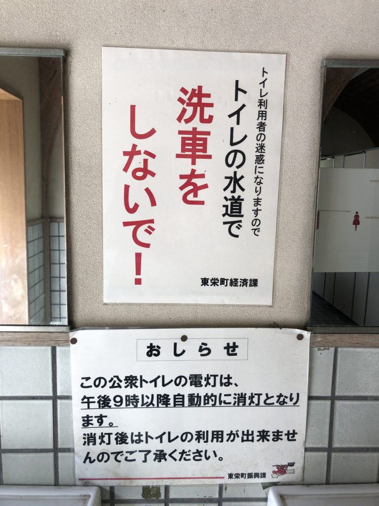 南信州方面にツーリングに行くときに良く寄る東栄町のトイレ。いつも気になる看板です。以前トイレの水道で洗車をする人がいたのかな?