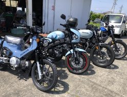 ショールームには青いバイクがいっぱい。他にも中古車仕上げ中のカブもあります。GB350Sは中古車。色々パーツが付いています。明日は昭和の日、祝日です。水曜日ですので畑オートはお休みします。お客様とツーリングに行ってきます。