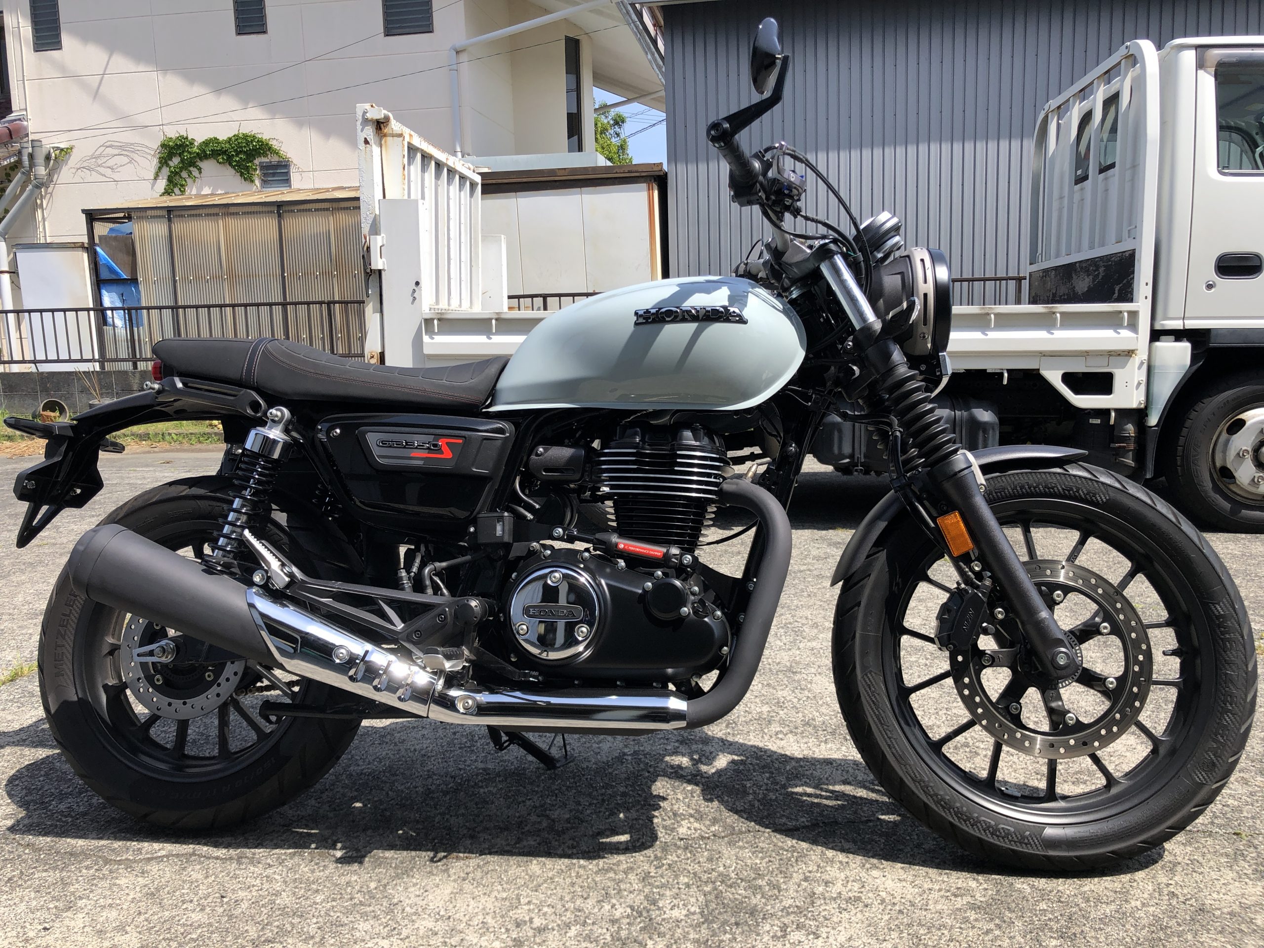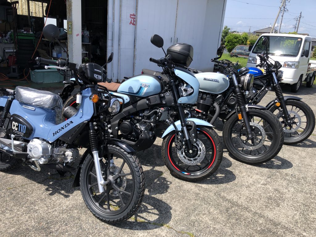 ショールームには青いバイクがいっぱい。他にも中古車仕上げ中のカブもあります。